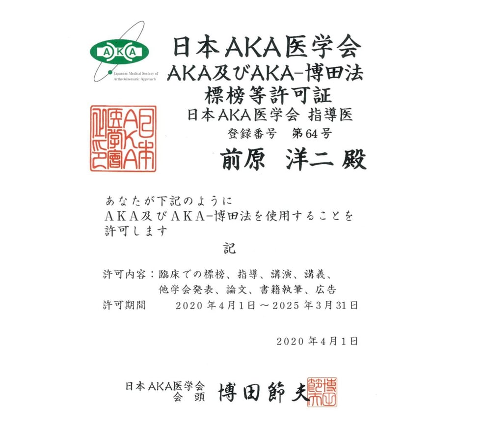 日本AKA医学会は1998年より指導医専門医制度を導入しました。指導医専門医資格はAKAの治療技術が一定水準以上に達していると日本AKA医学会が認めた資格です。
